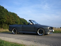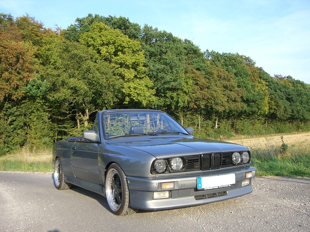 325i Cabrio 125KW/170PS stratusgrau metallic mit schwarzem Verdeck BJ 1987 Karosse komplett auf M3 Optik Umgebaut mit Originalen BMW Teilen (Frontschürze, Kotflügel, Seitenteile, Schweller, Heckschürze) elekt. Fensterheber vorne und hinten elekt. Verdeck großer Bordcomputer (BC2) BMW Traffic Pro Servolenkung M-Technik 2 klein Sportsitze Leder schwarz Zentralverriegelung Nebelscheinwerfer Original BMW Windschott weiße Blinkerstreugläserschwarze Hella Scheinwerfer schwarze Startec Rückleuchten KAW 60/40 Fahrwerk OZ Futura 8x17 ET31 LK 4x98 mit 215/40R17 rundum mit 25mm HR Adapter